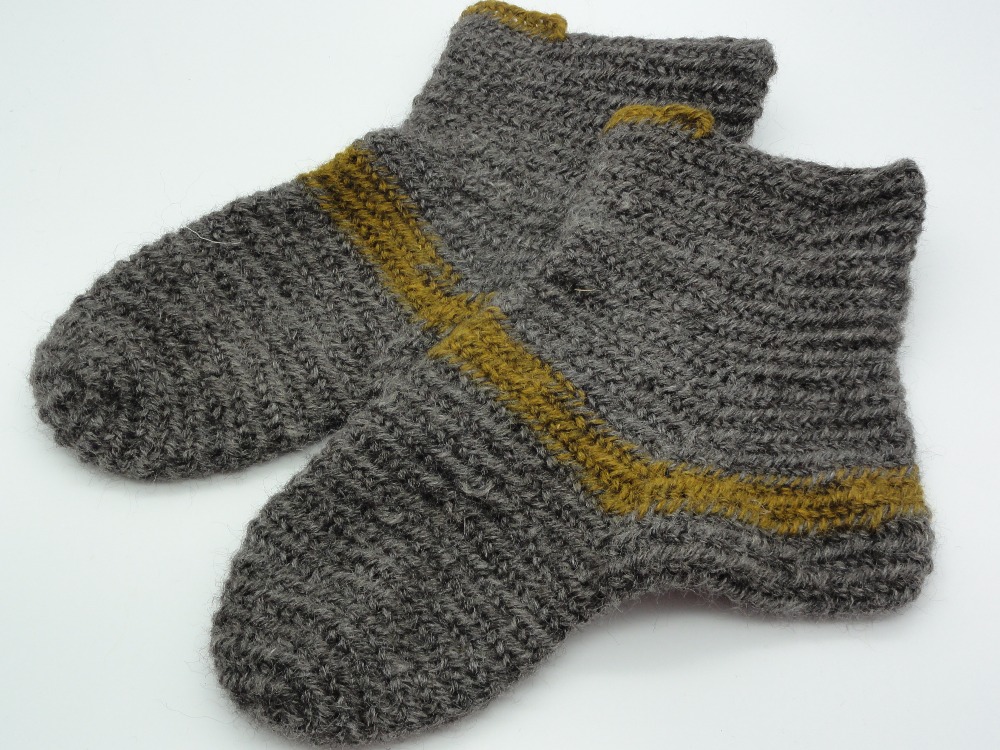 Nålebundne sokker i Gotlandsk pelsuld. Grå med en carry gul stribe. Str. 45